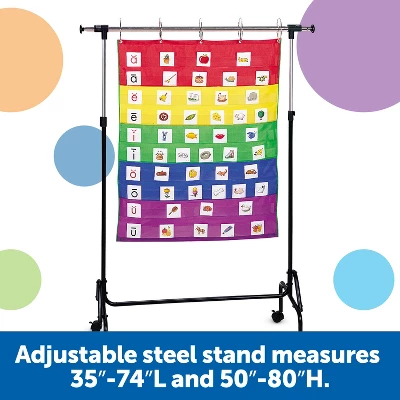 This versatile steel chart stand adjusts to hold both pocket and flip charts. Features sturdy locking casters and 5-ring style hooks for hanging. The height adjusts from 50″ to 80″ and the length from 35″ to 74″ for maximum display space. Easy to assemble. Great for use in the classroom, for homeschool, or in the office!