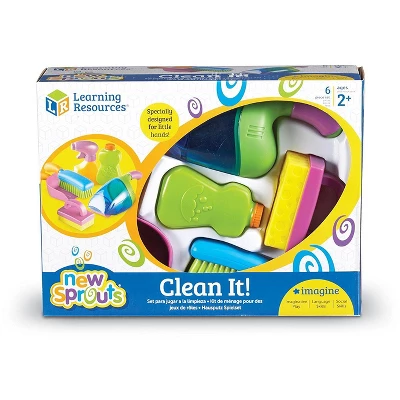 Sparkle and shine, it’s cleanup time! Encourage role play and participation in keeping things spick-and-span with this helpful set. Perfectly sized cleaning tools inspire imaginative play while building early vocabulary and social skills. Little ones can have fun while lending a hand with cleaning essentials including a duster, dustpan, spray bottle, sponge, bottle of cleaner, and hand vac that rattles and rolls. Largest piece (hand vac) measures 71/4″-L x 31/2″-H. -.