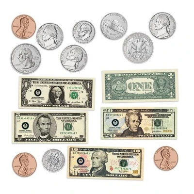 - 45-piece set includes 36 coins (pennies, nickels, dimes, and quarters) at 4x actual size, 9 bills (1-, 5-, 10-, and 20-dollar bills) at 1.5x actual size