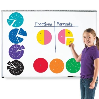 Demonstrate fractions, percentages and equivalencies on your whiteboard. Double-Sided Magnetic Fraction Circles Demonstrate fractions, percentages, and equivalencies on your whiteboard. Labeled with fractions on one side and percentages on the reverse. Color-coded to match other Rainbow Fraction® manipulatives for extended learning. Includes 9 circles (1 whole, 1/2, 1/3, 1/4, 1/5, 1/6, 1/8, 1/10, 1/12) and Activity Guide. Circles measure 7½” in diameter.