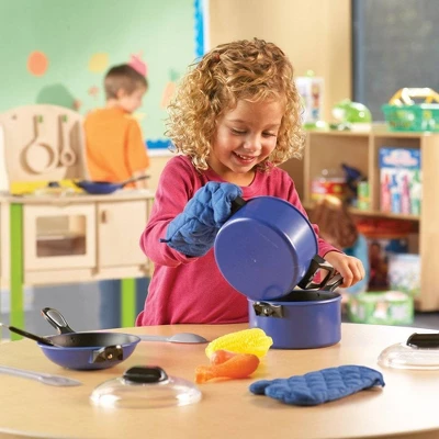 The Pretend & Play Pro Chef Set adds sizzle to hands-on creative play. Children use pots and pans that look like the real thing but are sized right for them. They will achieve success while cooking up fun and learning valuable skills in the process! Imitation of Mom and Dad in the kitchen leads to an understanding of what to do with the different pieces and a basic familiarity of how to prepare a meal.